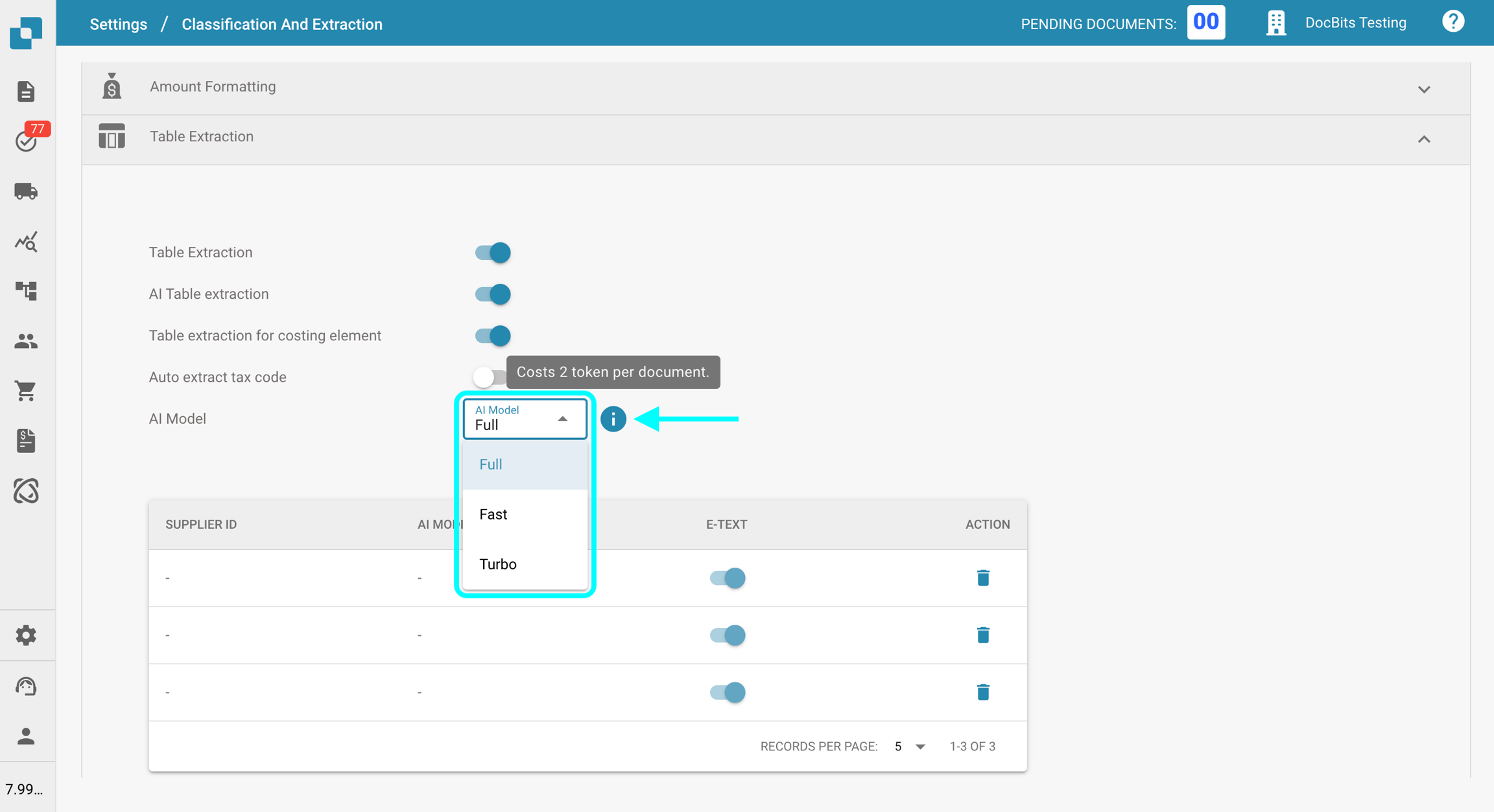 Le paramètre Modèle d'IA vous permet de définir quel modèle d'IA est utilisé par défaut pour l'extraction des champs et l'extraction de tableau lors du traitement des documents. Dans cette section, vous pouvez consulter le coût en tokens pour chaque modèle et voir quel modèle est actuellement assigné à chaque fournisseur.