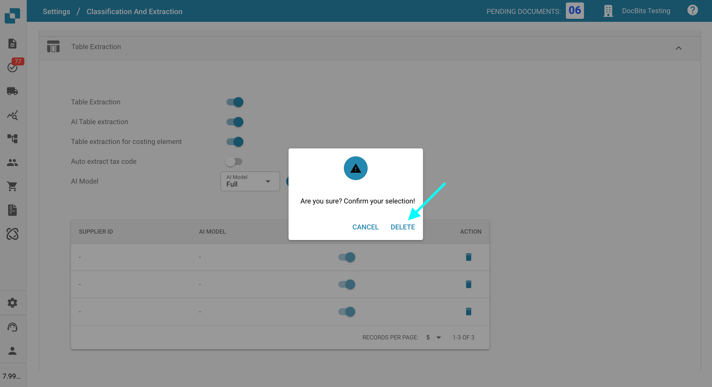 Une fois supprimé, le fournisseur reviendra à l'utilisation du modèle d'IA par défaut pour l'extraction des champs et l'extraction de tableau.