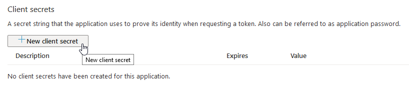 Dans l'écran Certificates & secrets, cliquez sur le bouton + New client secret dans la section Client secrets: