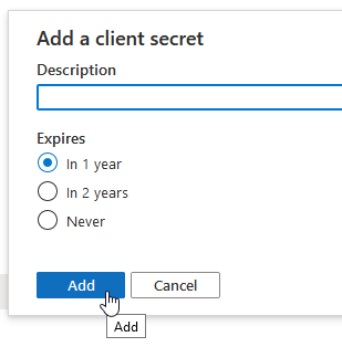 Dans la boîte de dialogue Add a client secret, cliquez sur le bouton Add: