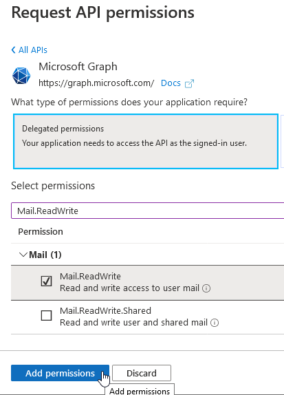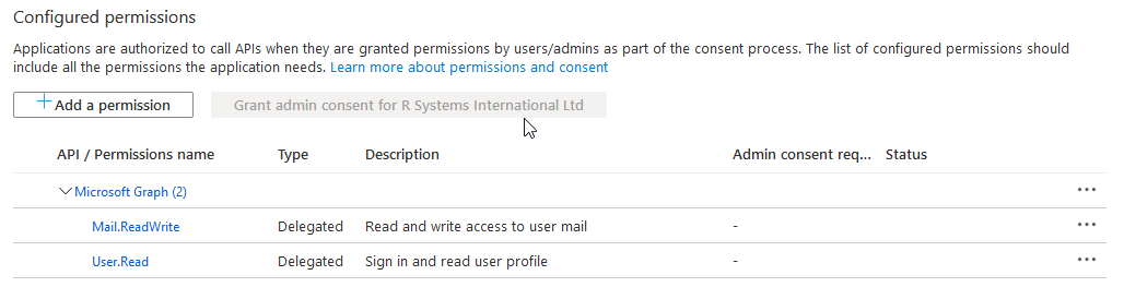 Cela ajoutera l'autorisation Mail.ReadWrite à la liste des Configured permissions pour l'App.