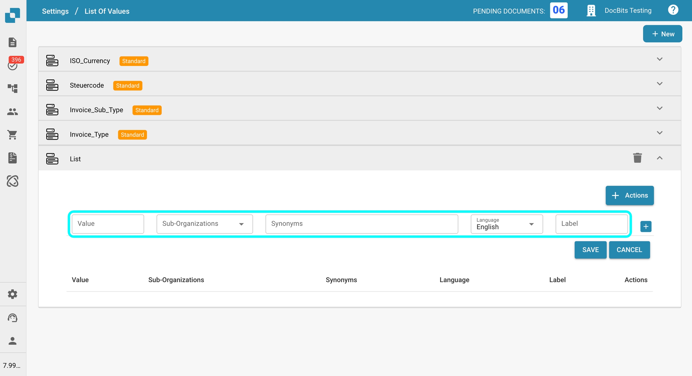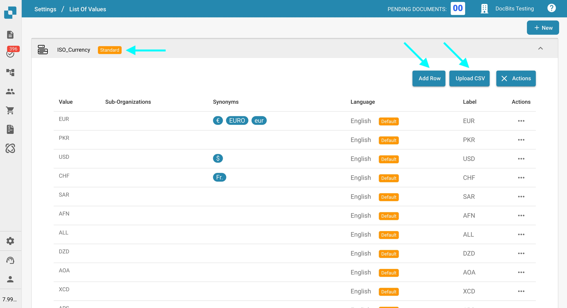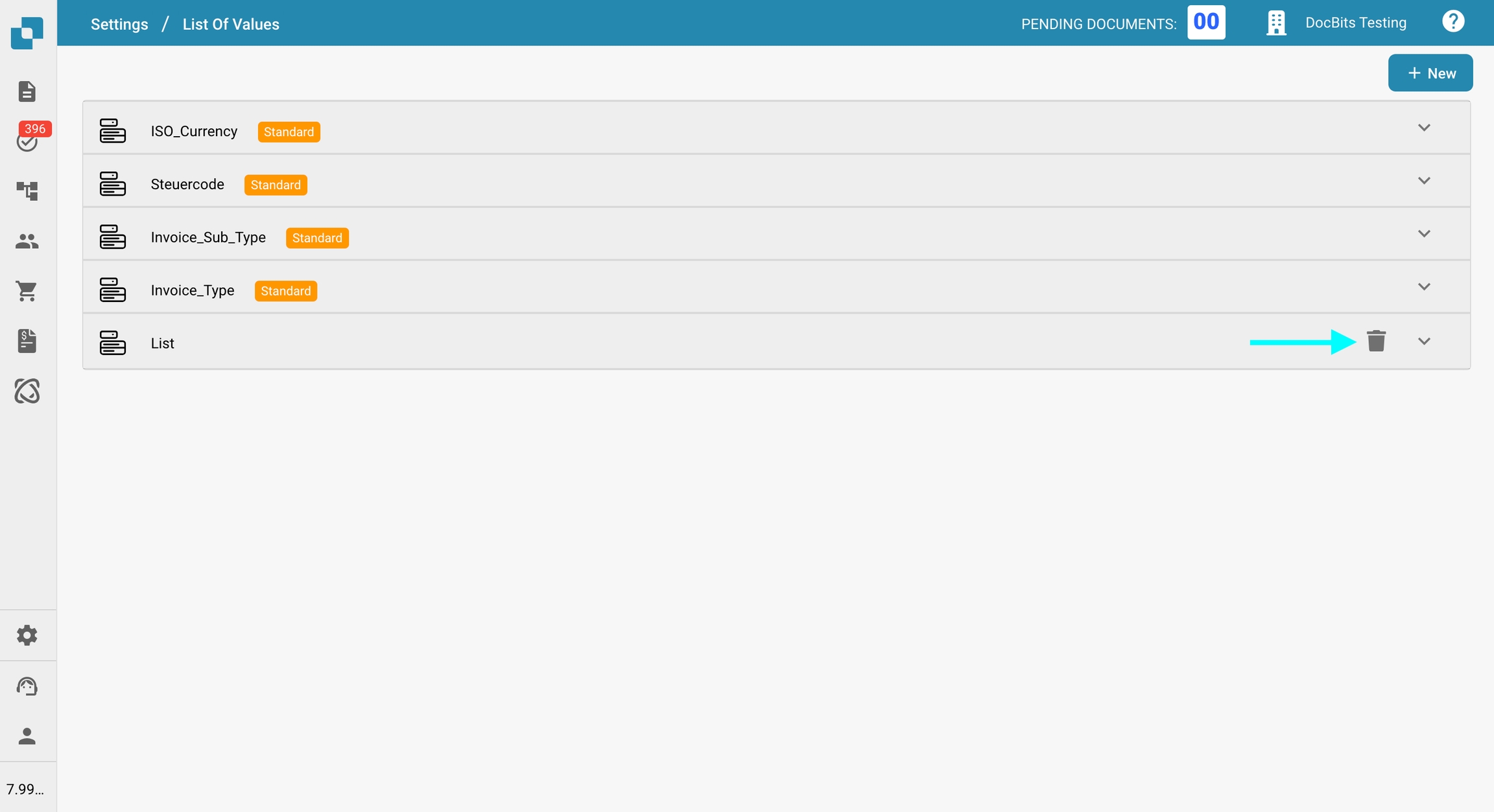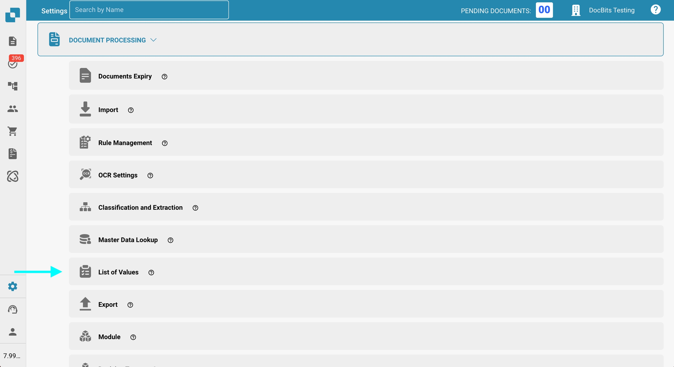 Vous pouvez accéder à la Liste de valeurs en naviguant vers Paramètres → Traitement des documents → Liste de valeurs.