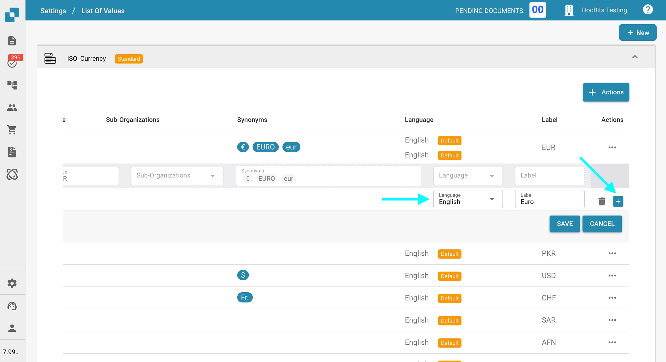 Synonymes : Ici, vous pouvez spécifier des valeurs supplémentaires qui aident à entraîner votre document. Par exemple, si EUR est votre valeur principale, vous pouvez ajouter EURO et € comme synonymes. Lorsque le document est entraîné en utilisant l'un de ces synonymes, DocBits reconnaîtra automatiquement et sélectionnera EUR comme valeur correspondante de votre liste. Remarque: Chaque synonyme doit être confirmé en appuyant sur Entrée pour l'ajouter à la liste.