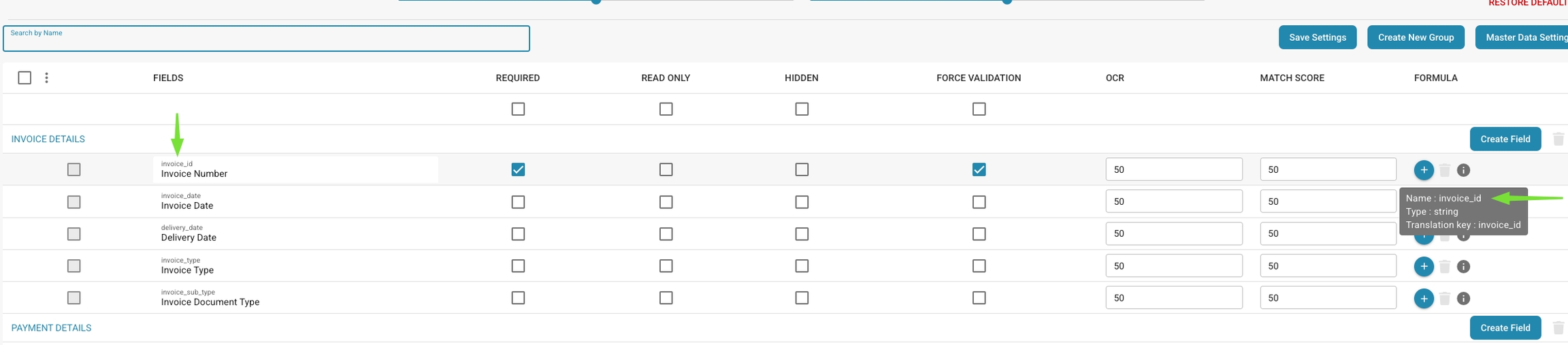 Le côté gauche représente l’ID du champ DocBits, que vous pouvez trouver dans Paramètres → Paramètres globaux → Types de documents → Facture → Champs.