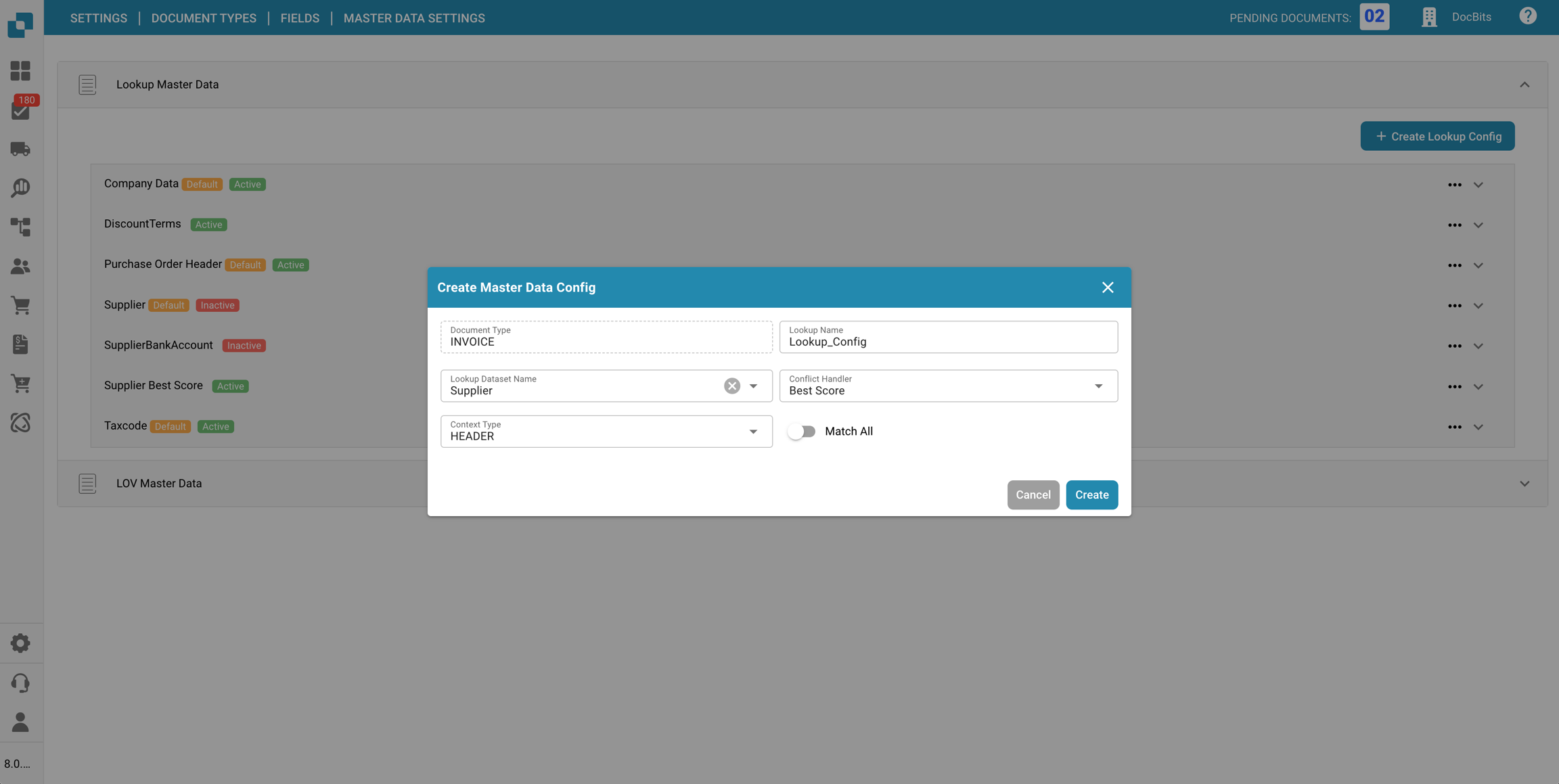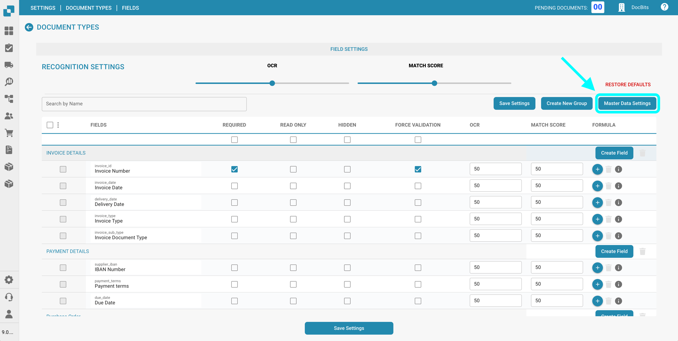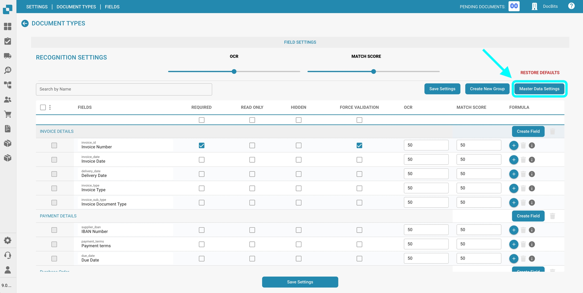 Dans la section Réglages des données de base des paramètres Champs pour un Type de document spécifique, vous pouvez afficher et configurer les mappages de données de base vers les champs utilisés lors de la validation des champs, en utilisant les données issues de Validation des données fournisseur.