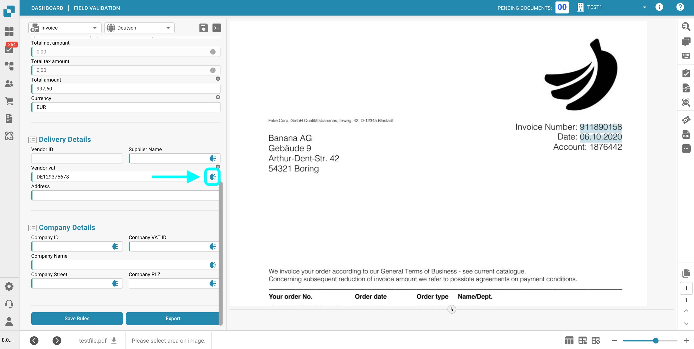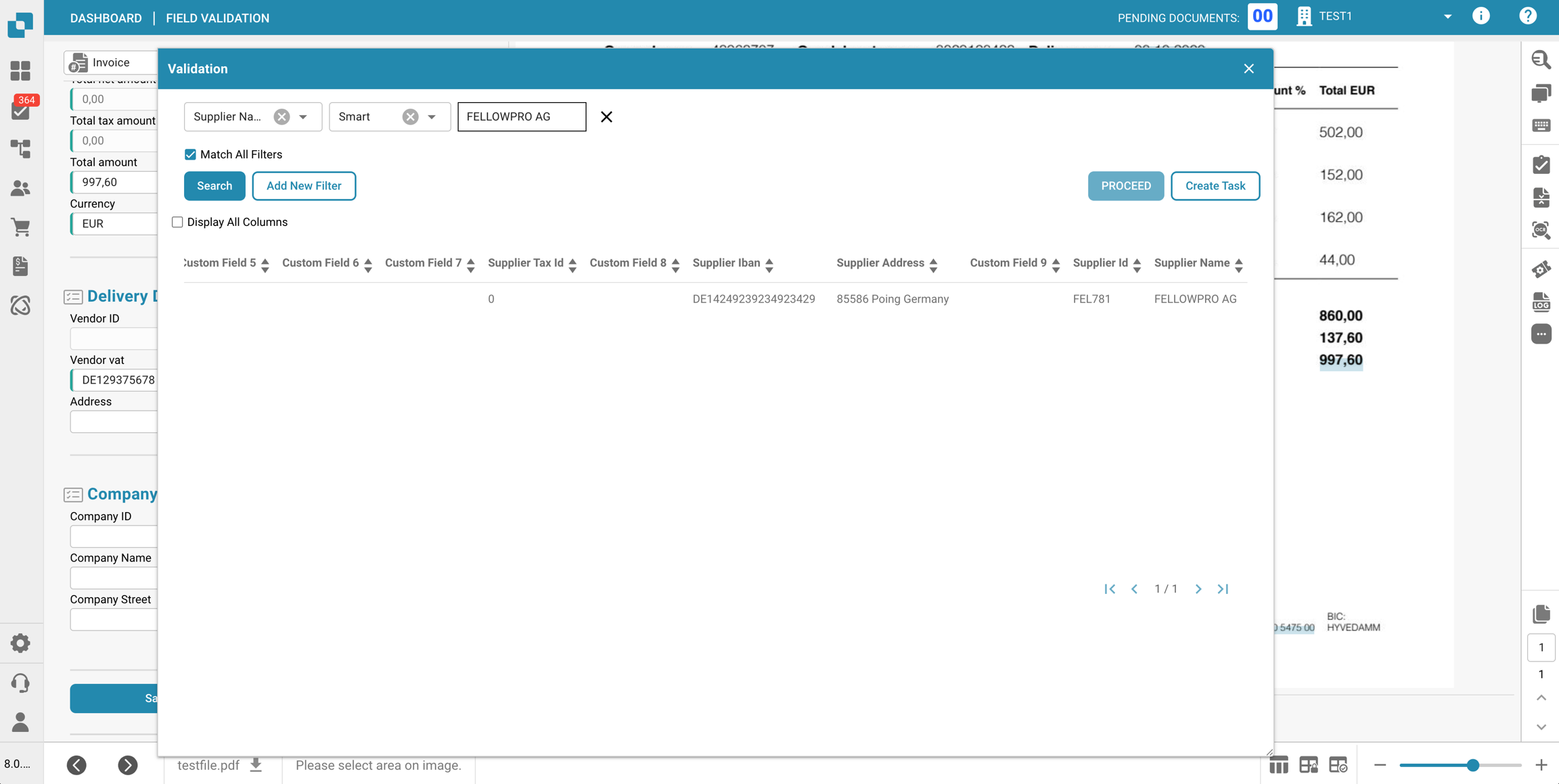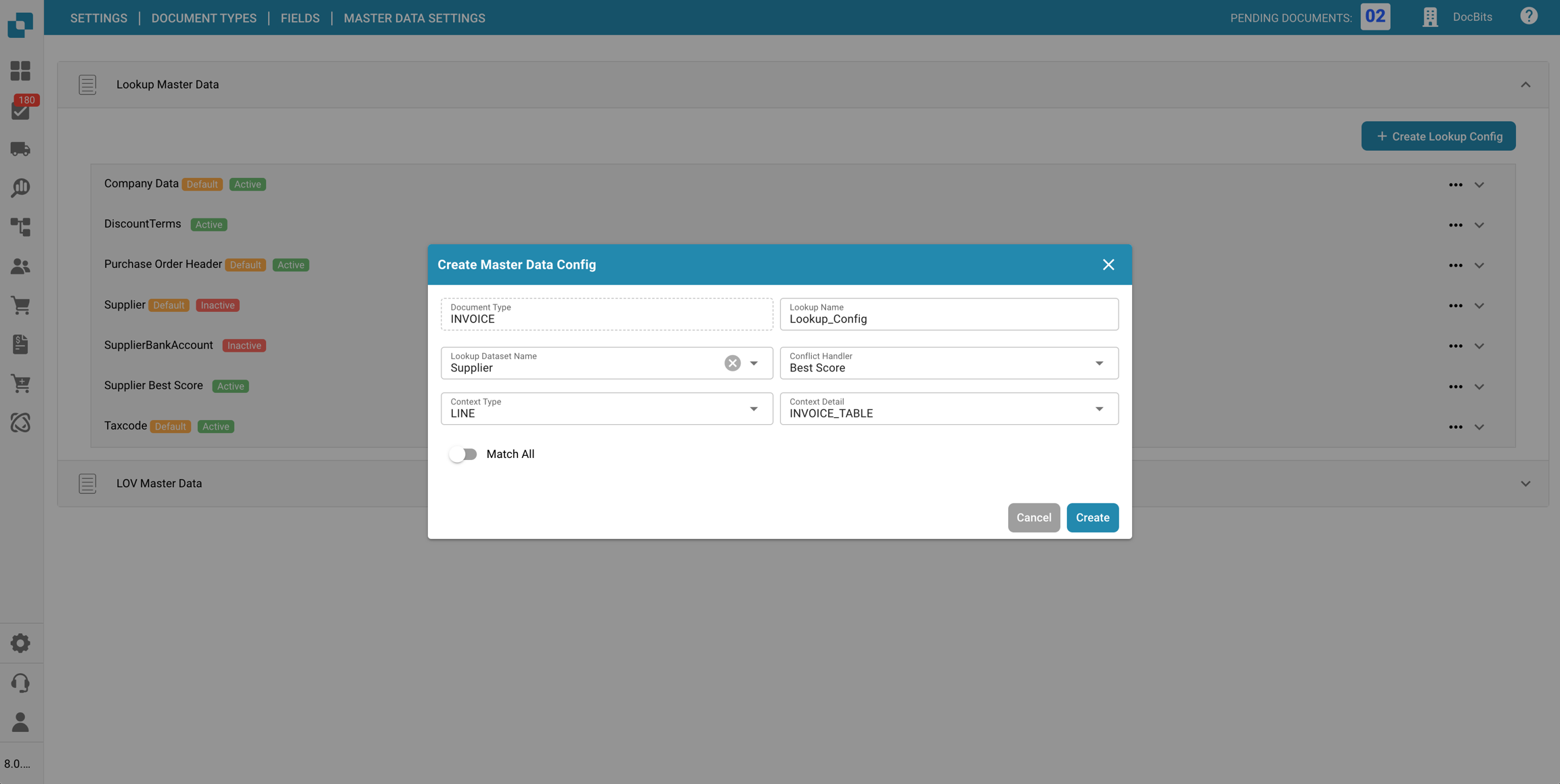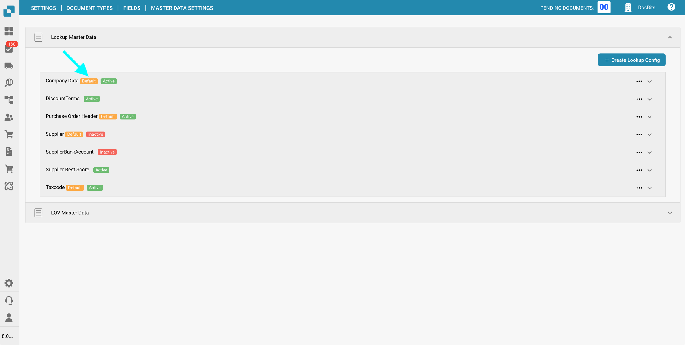 Dans la section Réglages des données de base des paramètres Champs pour un Type de document spécifique, vous pouvez afficher et configurer les mappages de données de base vers les champs utilisés lors de la validation des champs, en utilisant les données issues de Validation des données fournisseur.