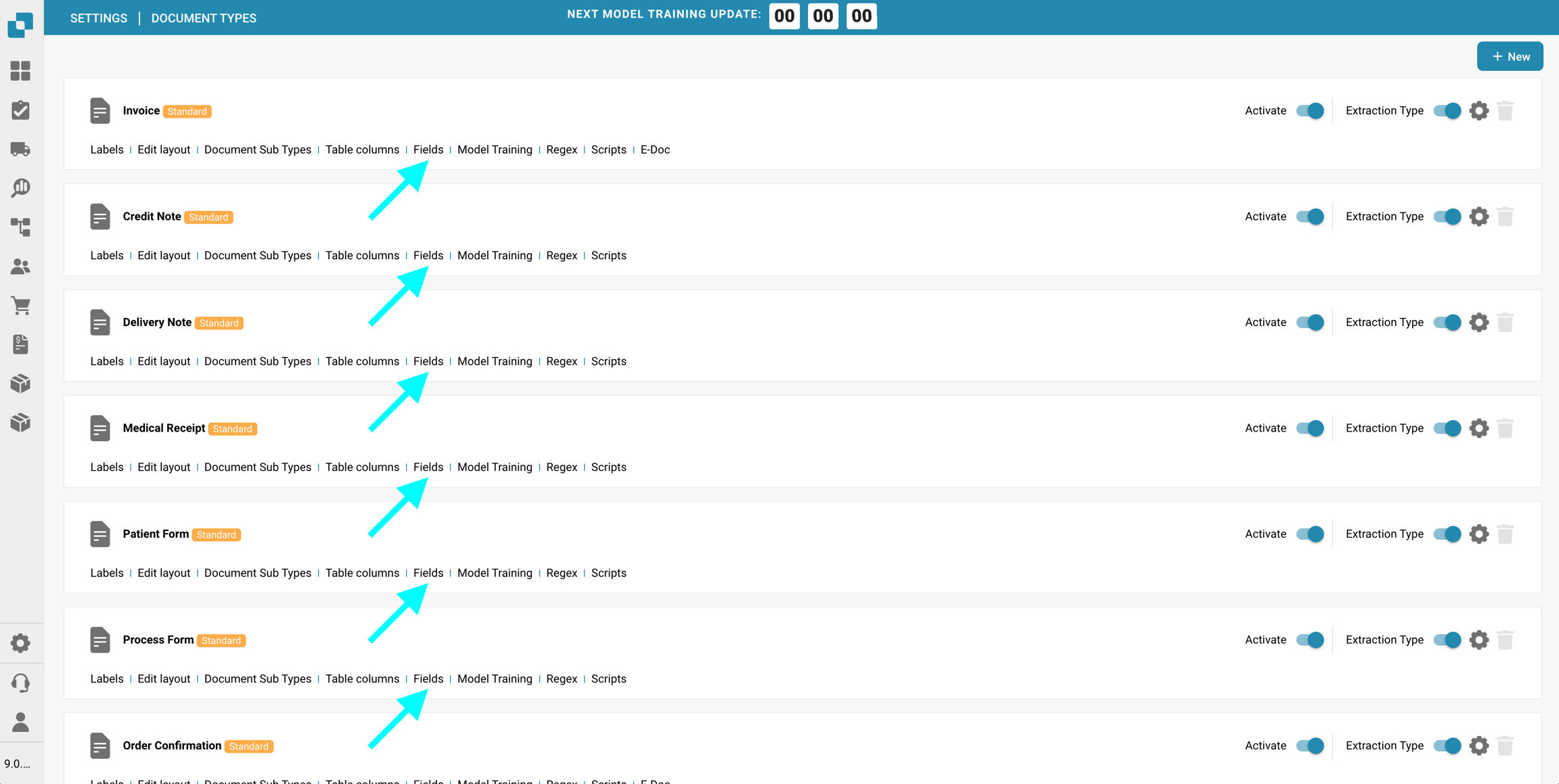 Sélectionnez le Type de document souhaité et cliquez sur Champs.
