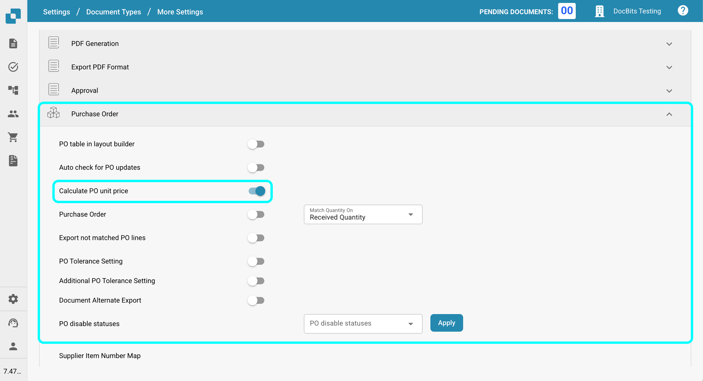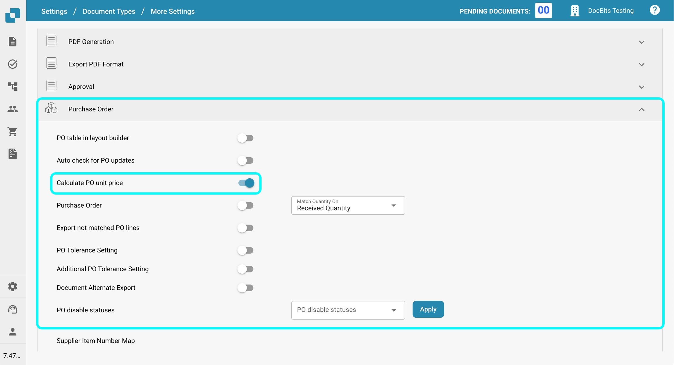 Dans la section Bon de commande, activez l'option Calculer le prix unitaire de la commande.