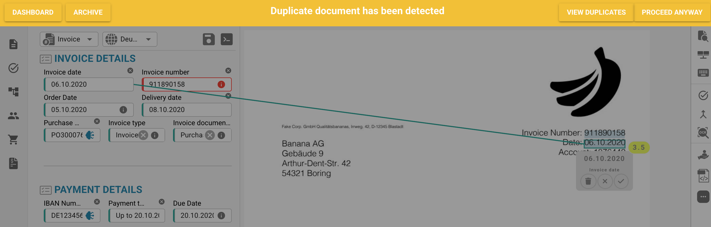 Détection des factures en double (Disponible uniquement pour le type de document Facture) : Cette fonctionnalité nécessite la synchronisation des factures fournisseurs d'Infor vers DocBits. Elle compare les numéros de facture dans le tableau de bord DocBits avec ceux d'Infor. Si le même numéro de facture apparaît plus d'une fois, il sera signalé comme un doublon.