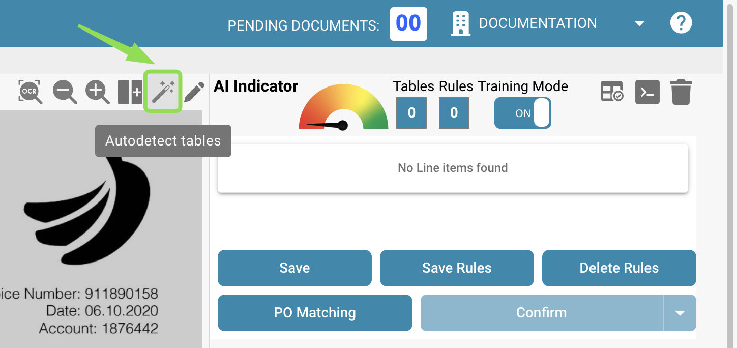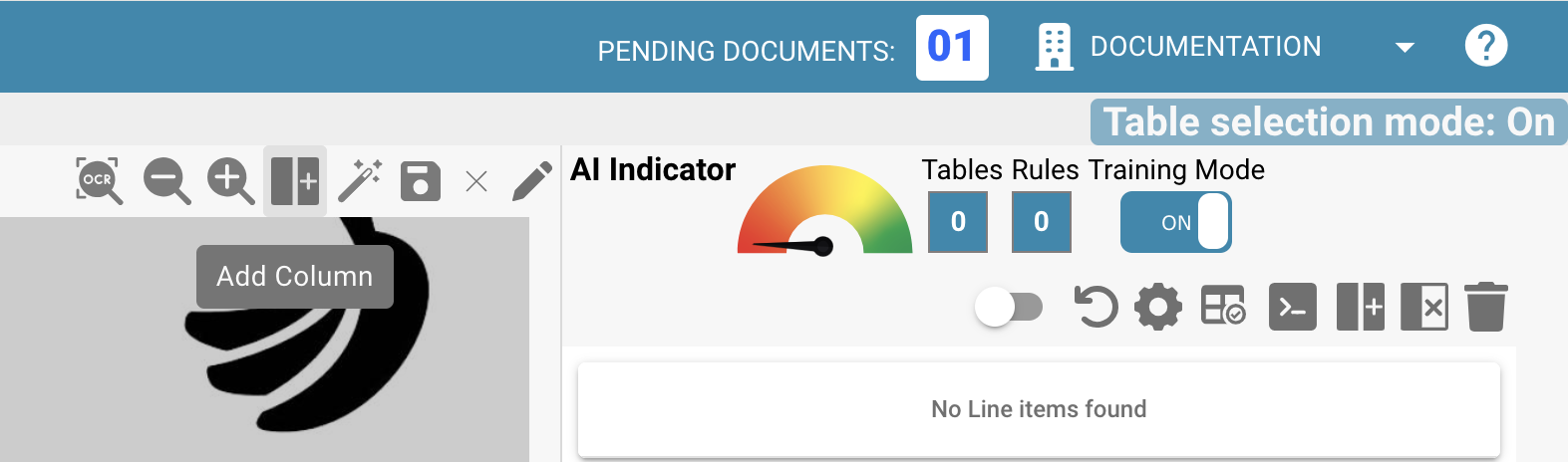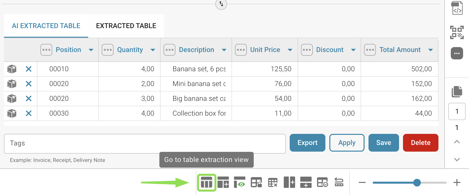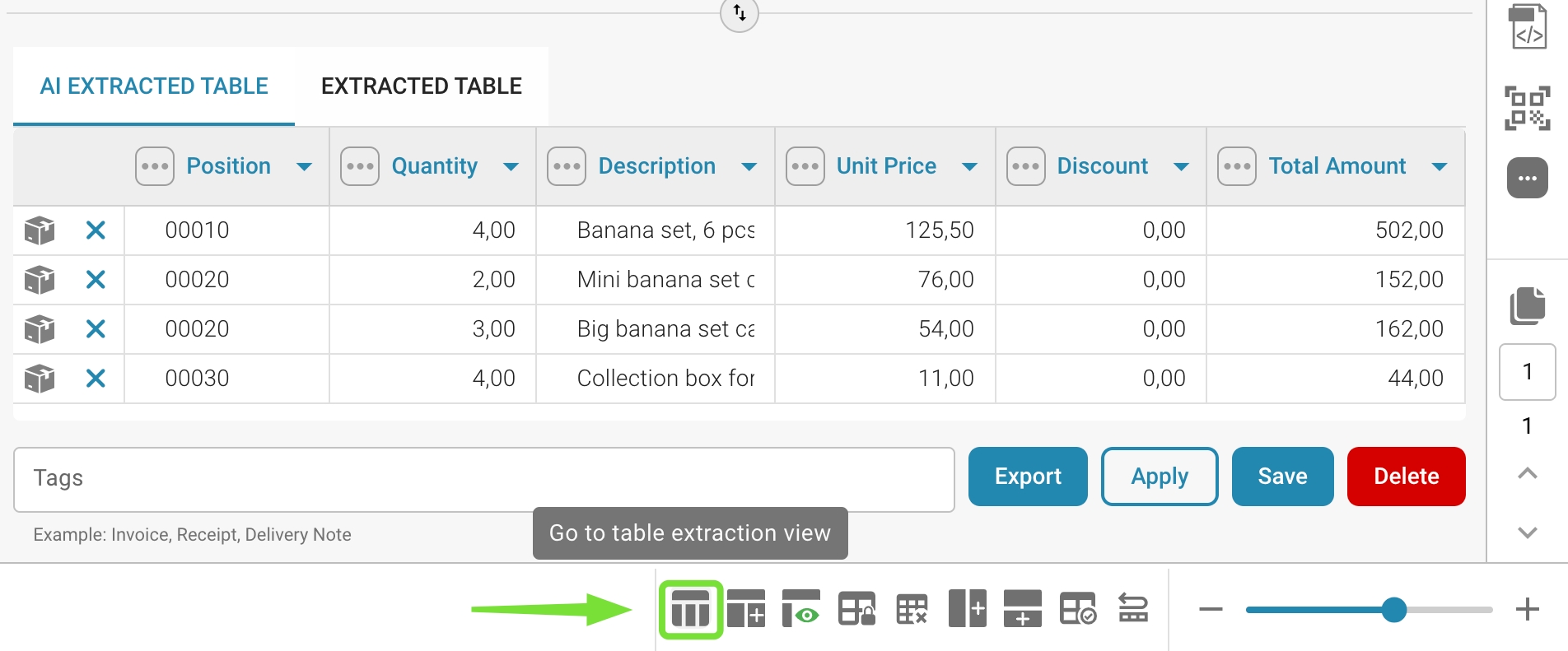 Pour définir des tables et des colonnes dans un document, veuillez importer un document, l'ouvrir et accéder à la vue d'extraction de table comme déjà connu (via "Éléments de ligne").