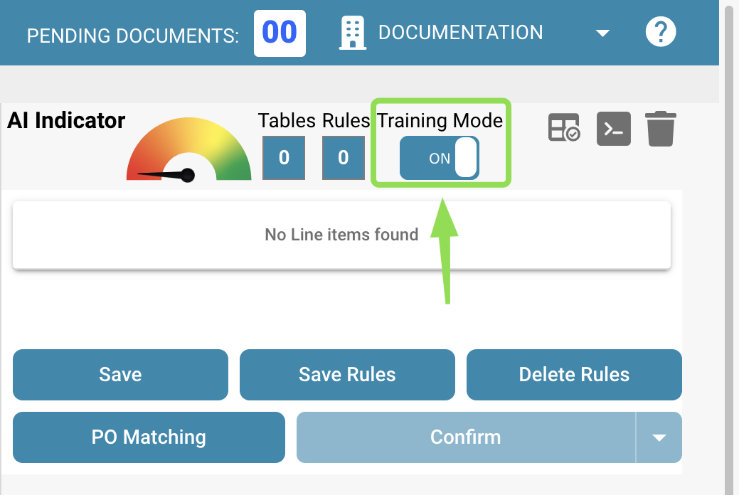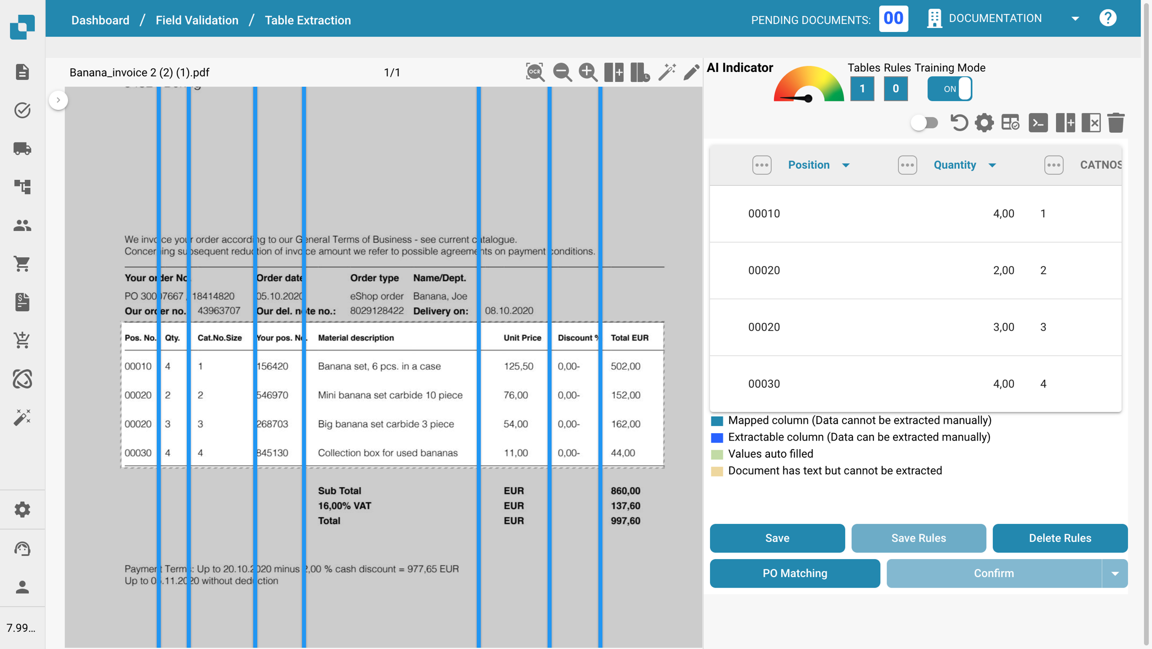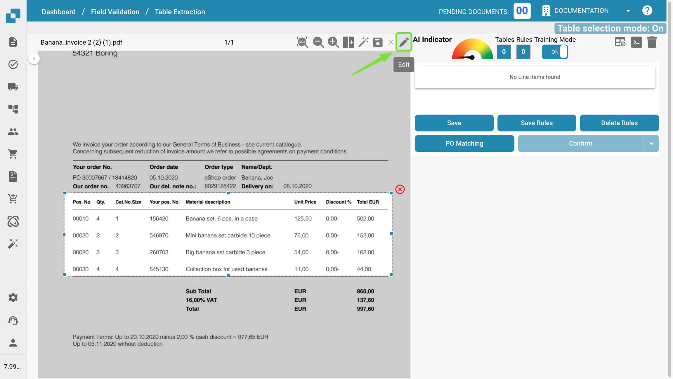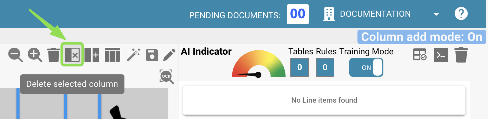 Pour définir des tables et des colonnes dans un document, veuillez importer un document, l'ouvrir et accéder à la vue d'extraction de table comme déjà connu (via "Éléments de ligne").