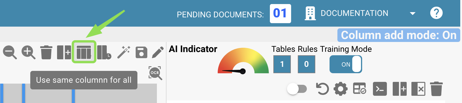 Définissez et triez les colonnes en les faisant glisser et déposer sur le document. Répétez cela pour les tables sur les autres pages également. En alternative, si les tables sont identiques sur chaque page, vous pouvez utiliser le bouton suivant pour utiliser la même colonne pour toutes les tables définies dans le document. Cette fonctionnalité copie les colonnes que vous avez définies sur toutes les autres pages également :