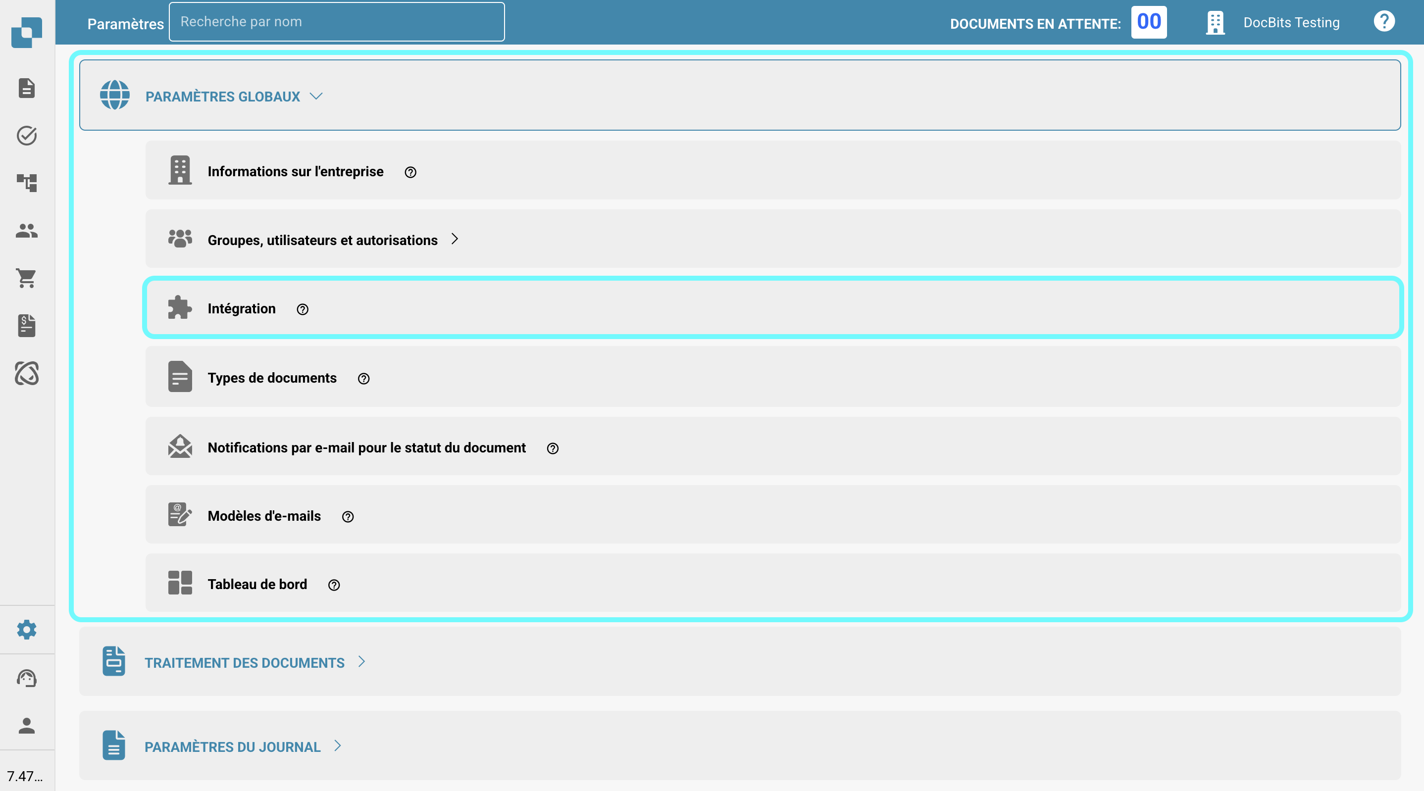 * La clé API peut être trouvée dans DocBits dans Paramètres -> Paramètres Globaux -> Intégration