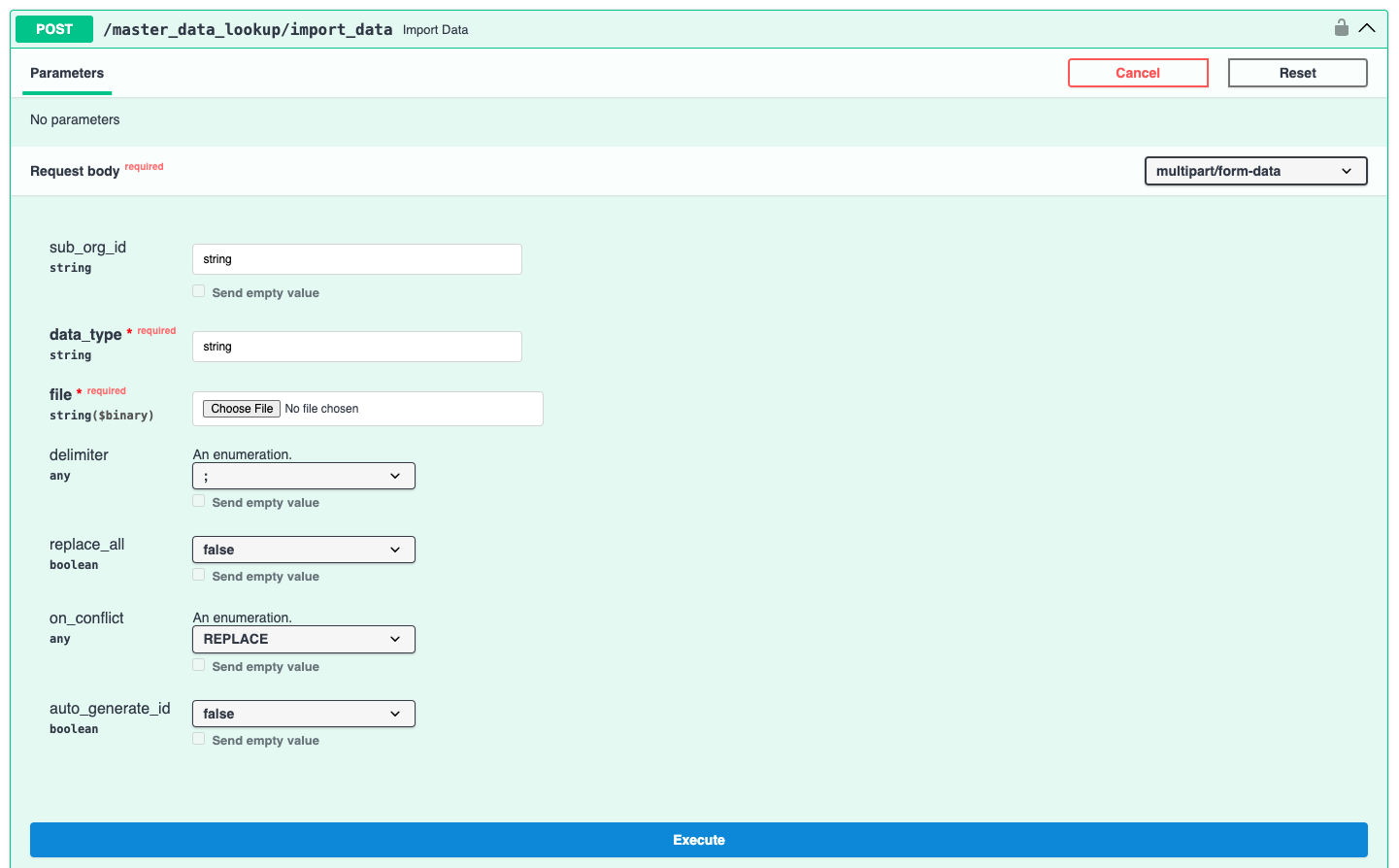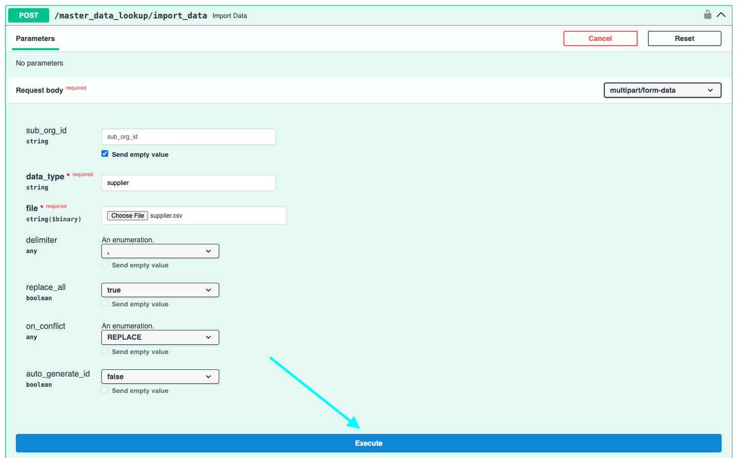 * **replace\_all :** Ce paramètre booléen détermine si toutes les données existantes dans la table de base de données respective (`supplier` ou `purchase_order`) pour l'organisation spécifiée doivent être supprimées avant d'insérer les nouvelles données du fichier .csv. Réglez cela sur `true` pour remplacer toutes les données existantes ou `false` pour ajouter ou mettre à jour avec les nouvelles données.