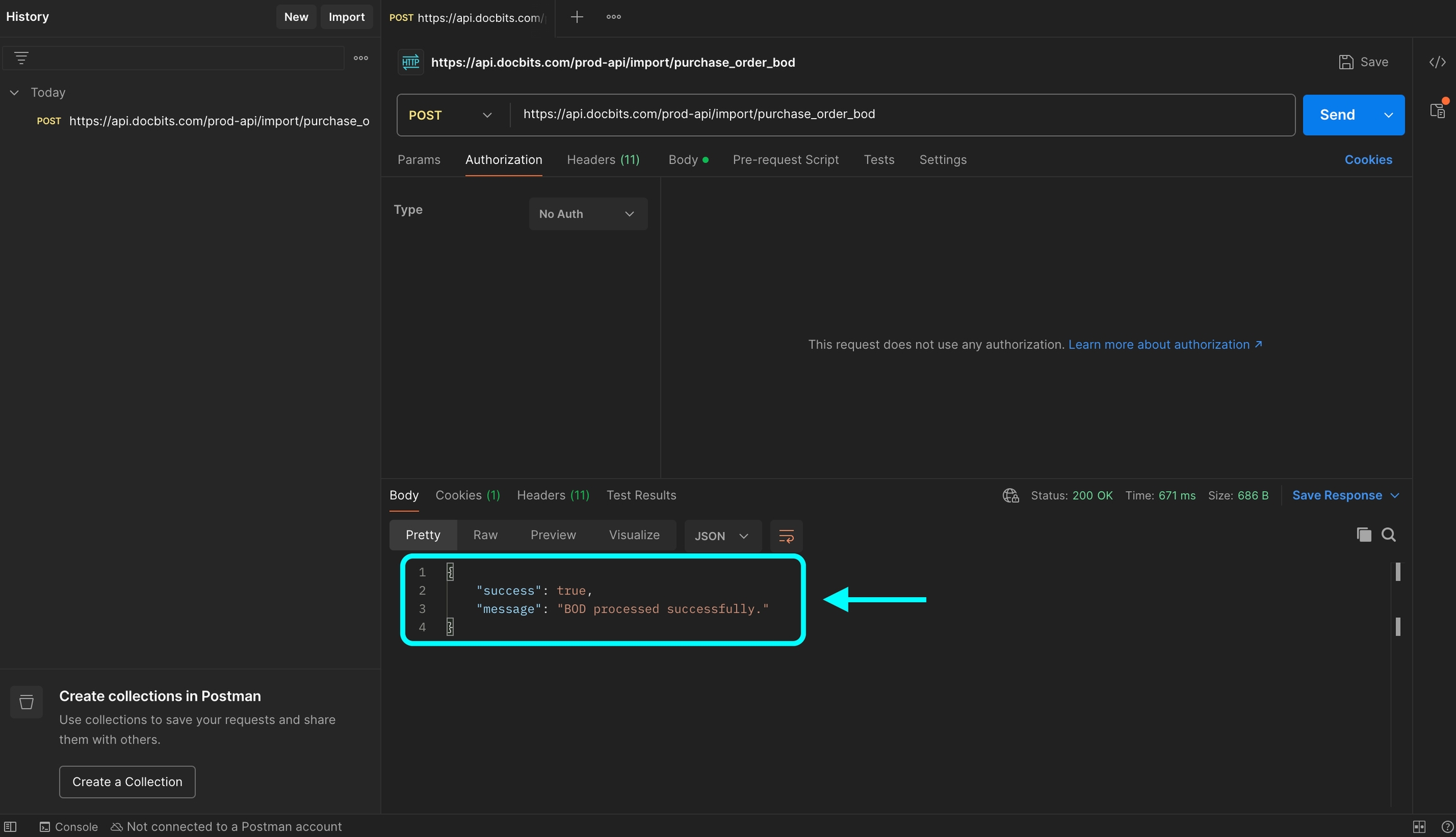 Cette page explique comment vérifier le traitement réussi de votre BOD (Business Object Document) en utilisant Postman. Vous allez tester le point de terminaison API pertinent en envoyant une requête avec votre fichier de mappage BOD. Suivez les étapes ci-dessous pour compléter le processus.