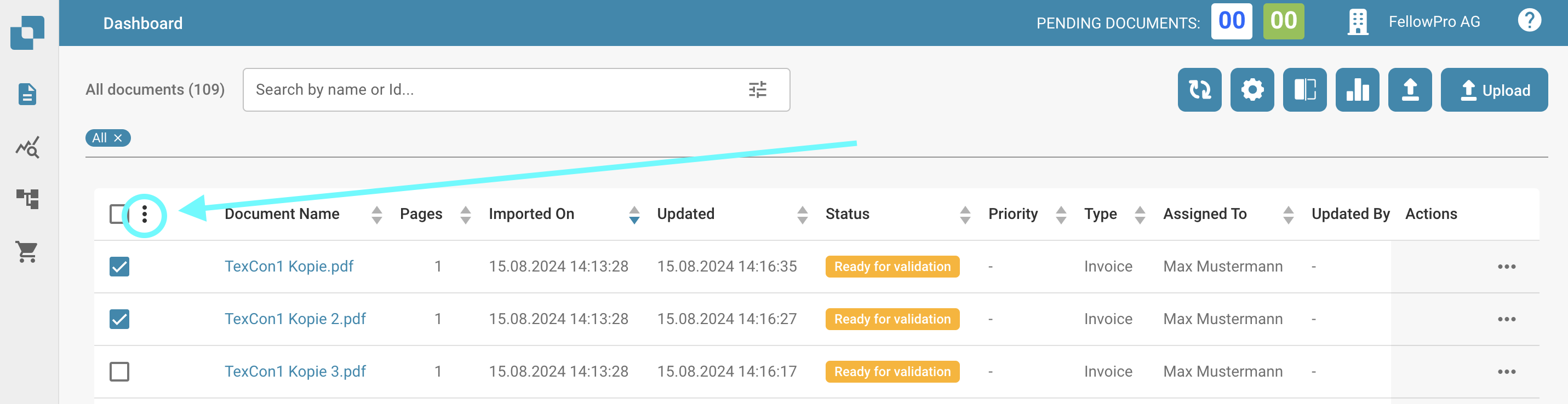 Tout d'abord, vous devez sélectionner les documents que vous souhaitez fusionner. Cela peut être fait en sélectionnant les cases à cocher des documents. Une fois que vous avez sélectionné les documents, cliquez sur l'icône avec trois points.