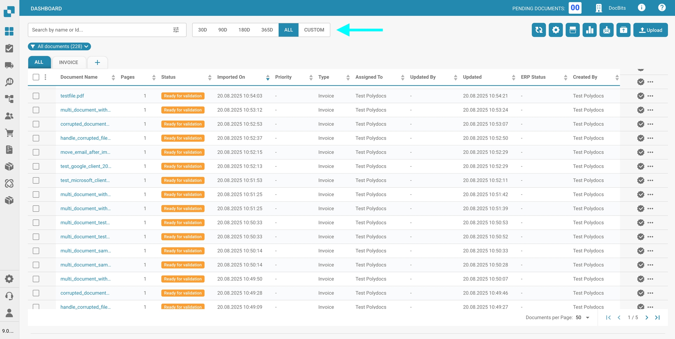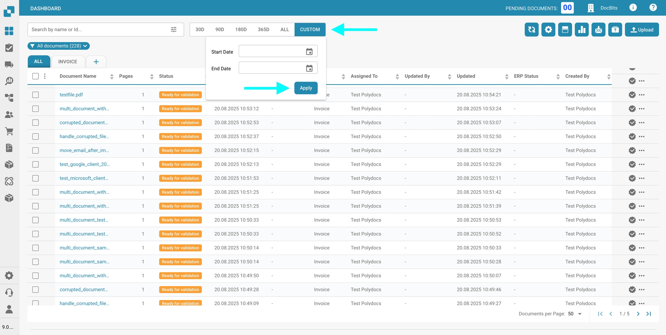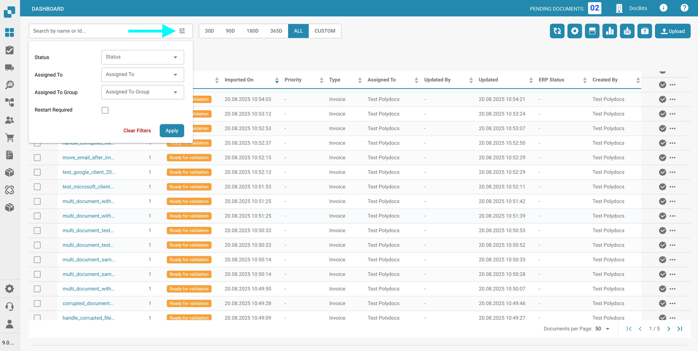 Statut: Filtrer par Statut de traitement (par ex., Ready for validation, Rejected).