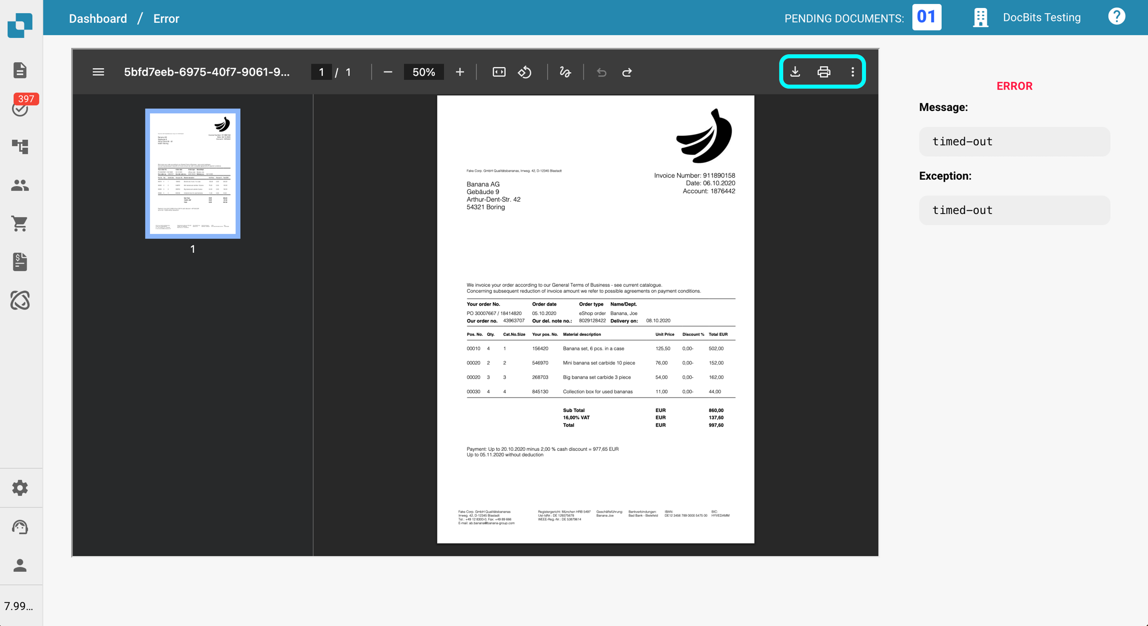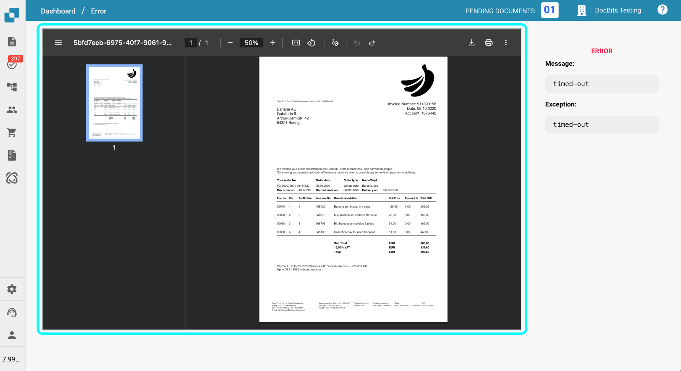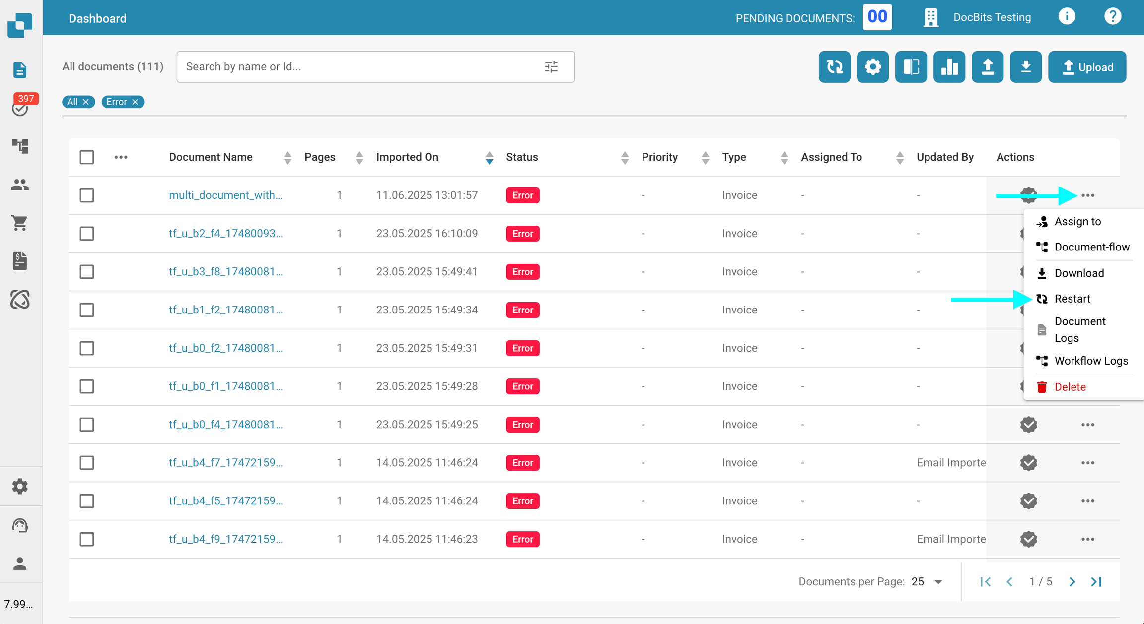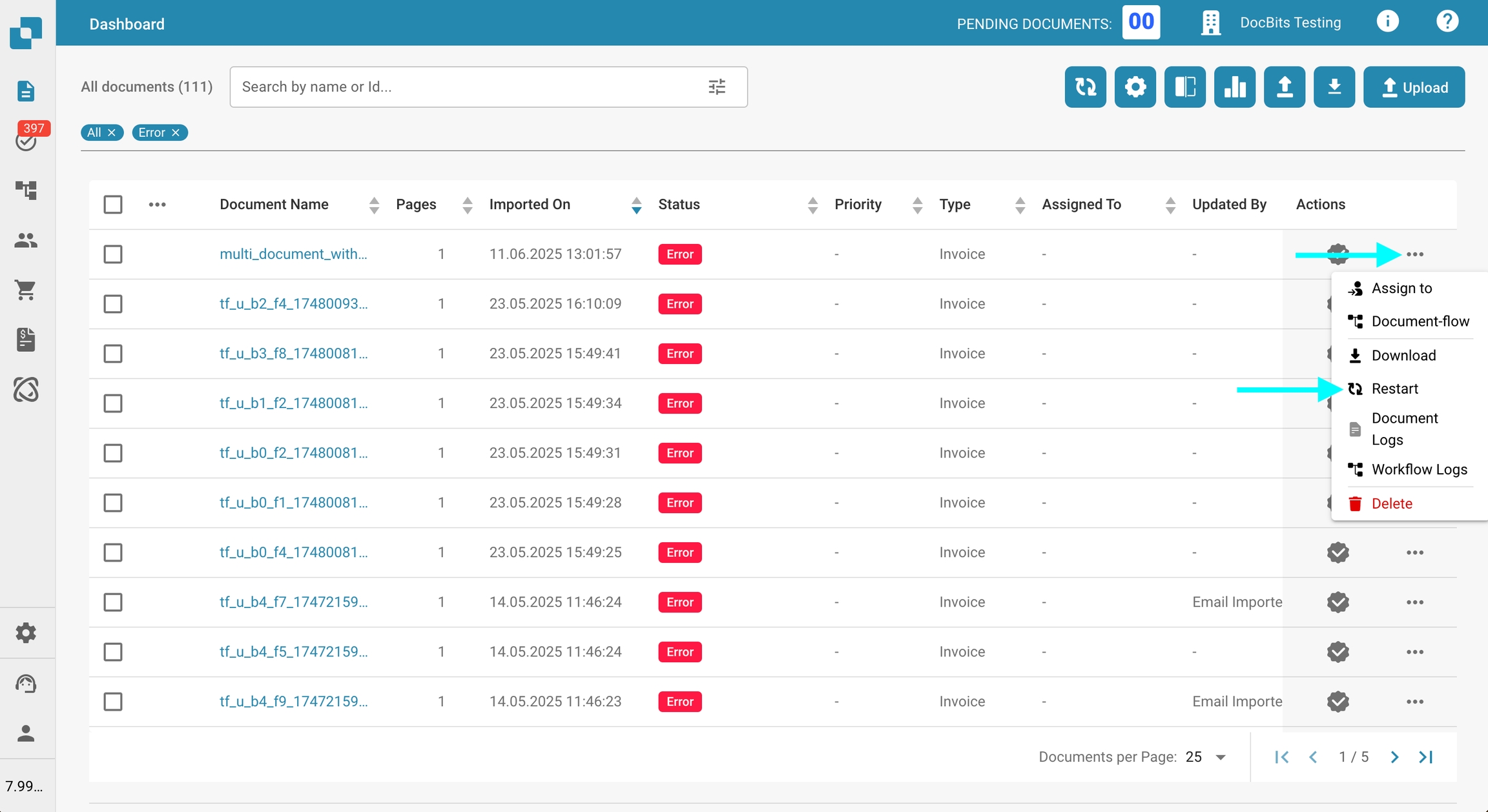 Si une erreur se produit pendant votre flux de travail de document, le document entrera dans le statut "Erreur". Lorsque cela se produit, vous pouvez cliquer sur le document pour :