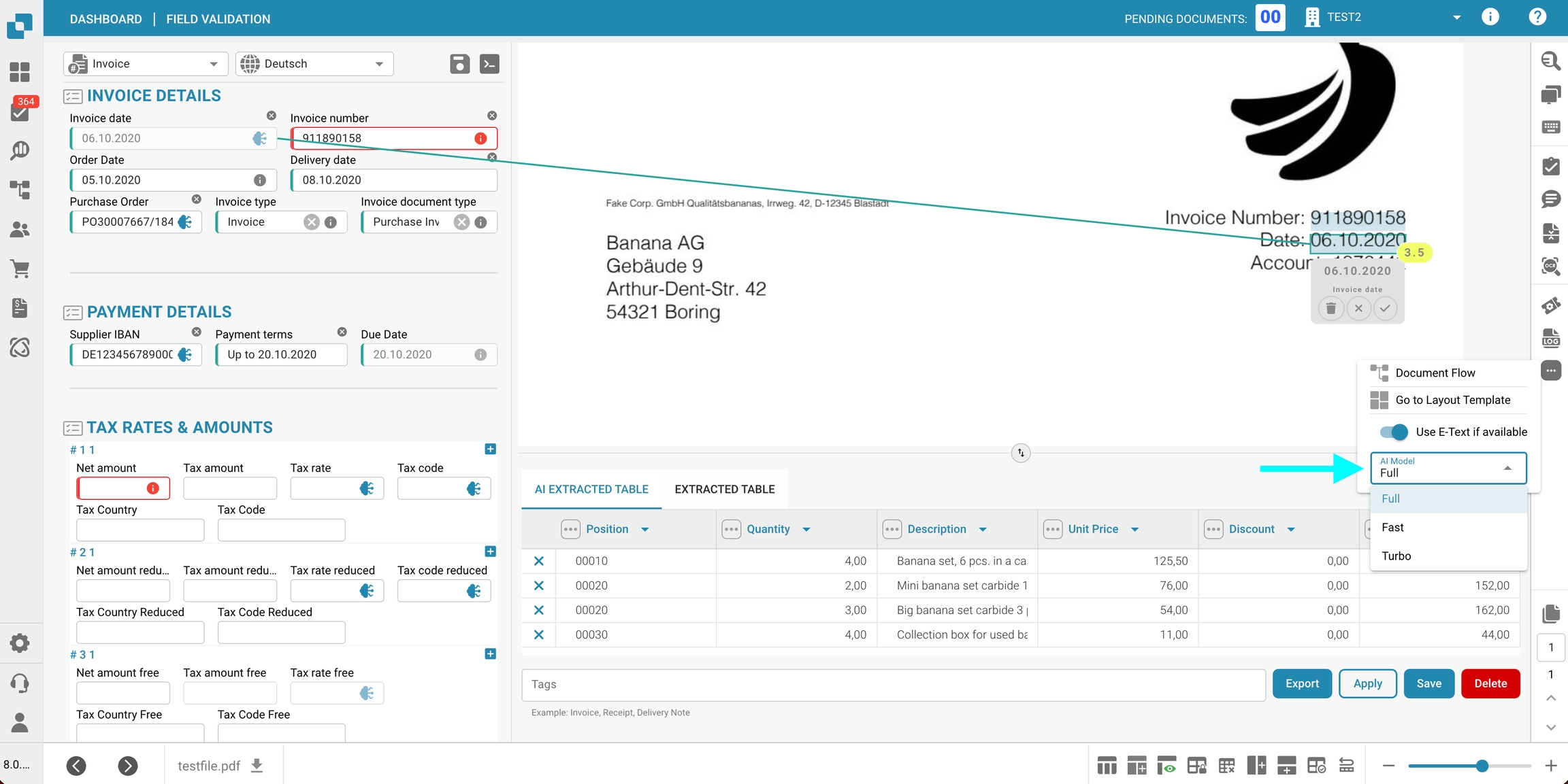 Dans la section des outils de l'Écran de validation, vous pouvez choisir le modèle d'IA utilisé pour l'Extraction de champs et l'Extraction de tableaux. Le modèle d'IA sélectionné s'applique uniquement à tous les documents du fournisseur actuel.