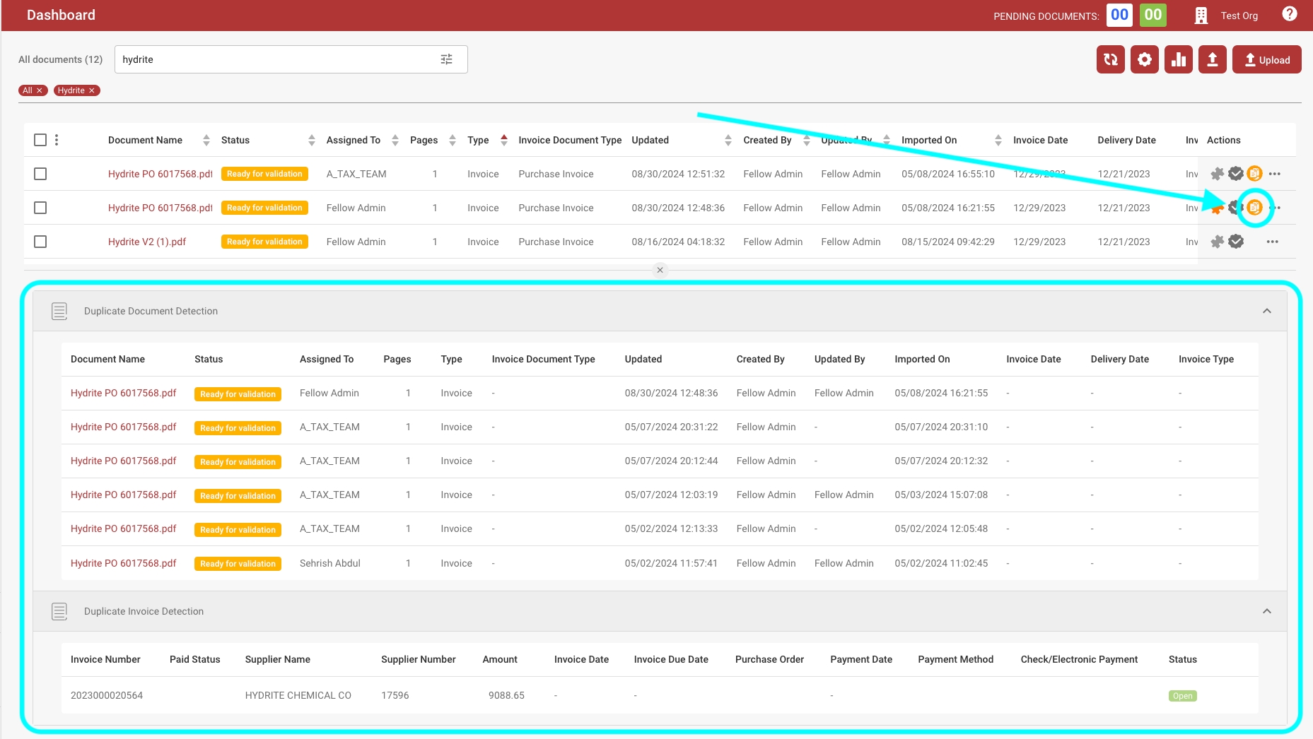 Une fois la Détection des doublons activée, tous les documents identifiés comme doublons afficheront une icône d'indicateur de doublon sur le tableau de bord.