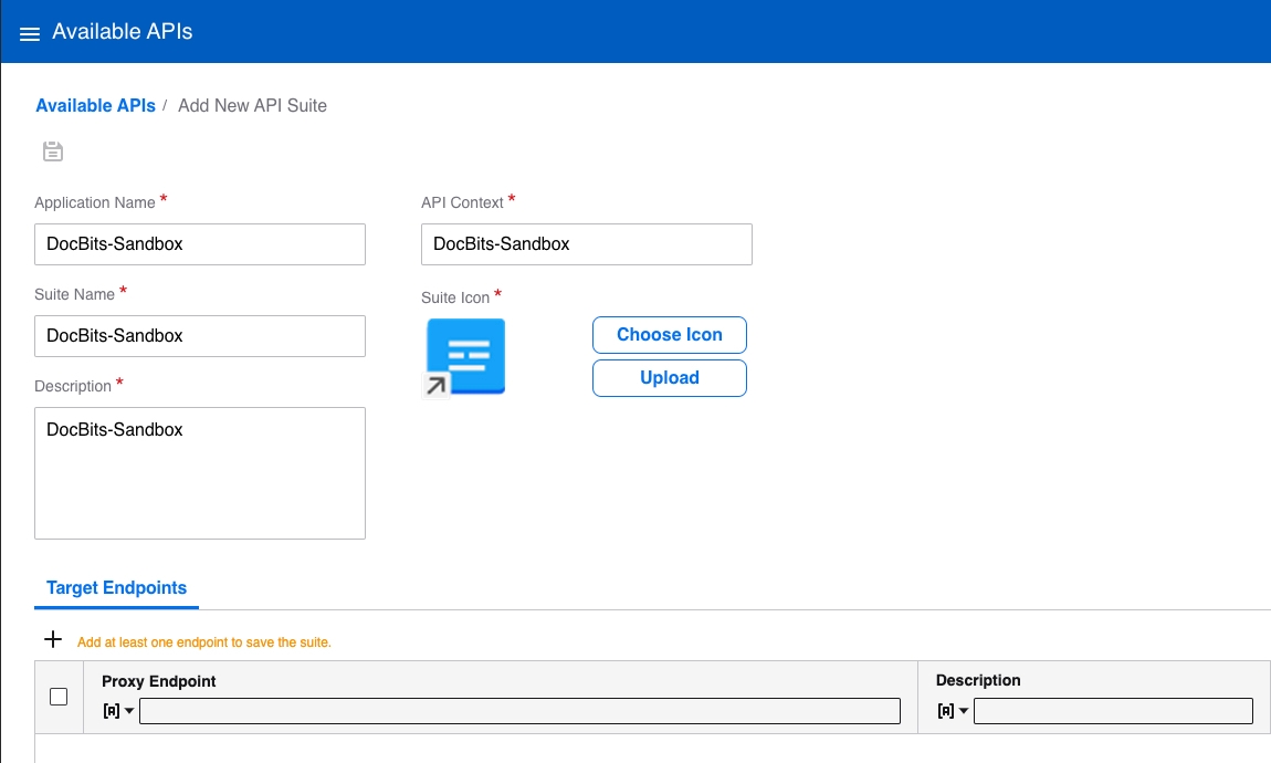 DocBits-Stage,DocBits-Sandbox,DocBits-ProdouDocBits-Demo(selon votre environnement).Suite Name : Identique au nom de l'application.