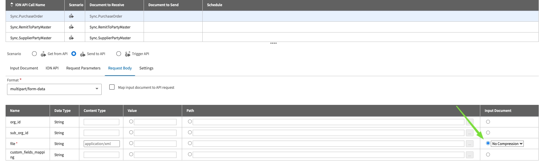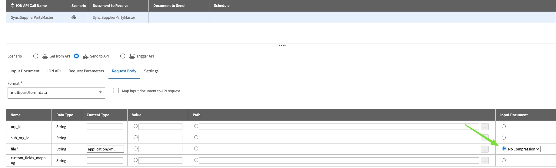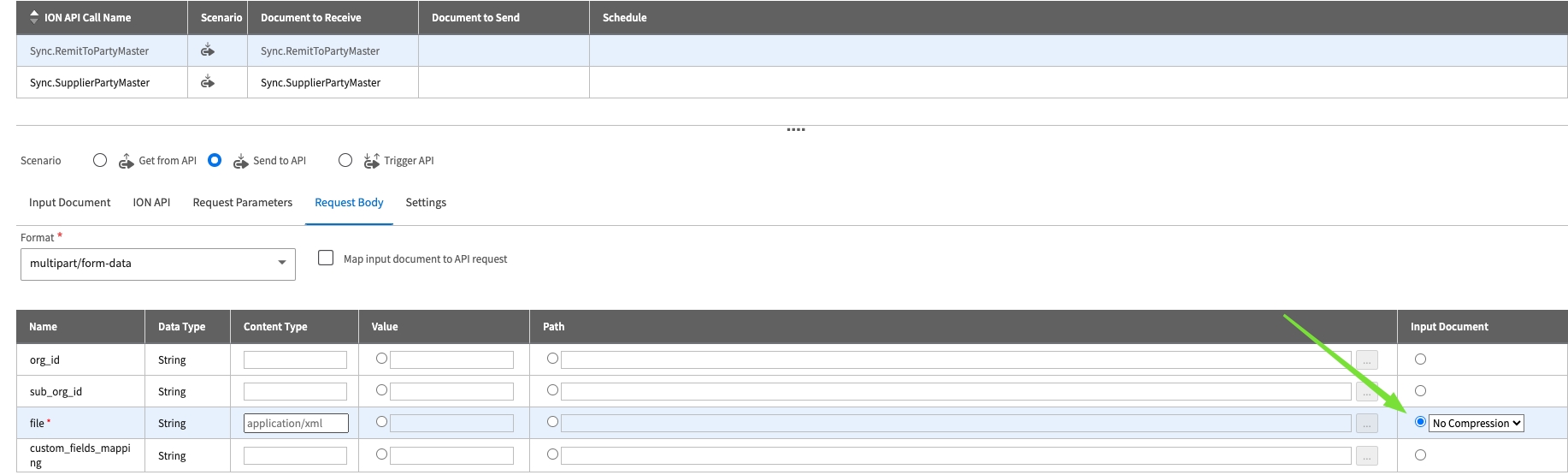 { "ID": "//DataArea/LnTaxCode/DocumentID/ID" }Pour File, définissez Input Document = No Compression.