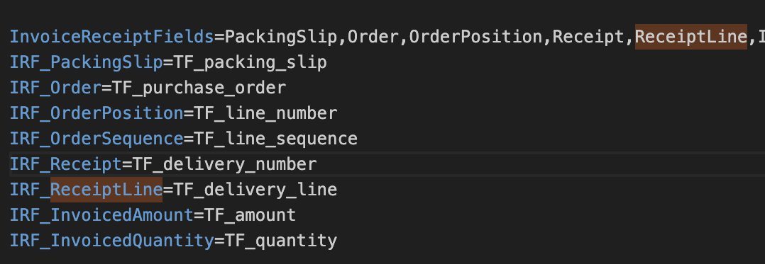 * Si le champ **IRF\_ReceiptLine** n'est **pas présent**, ajoutez-le au fichier et définissez sa valeur sur **TF\_delivery\_line**.