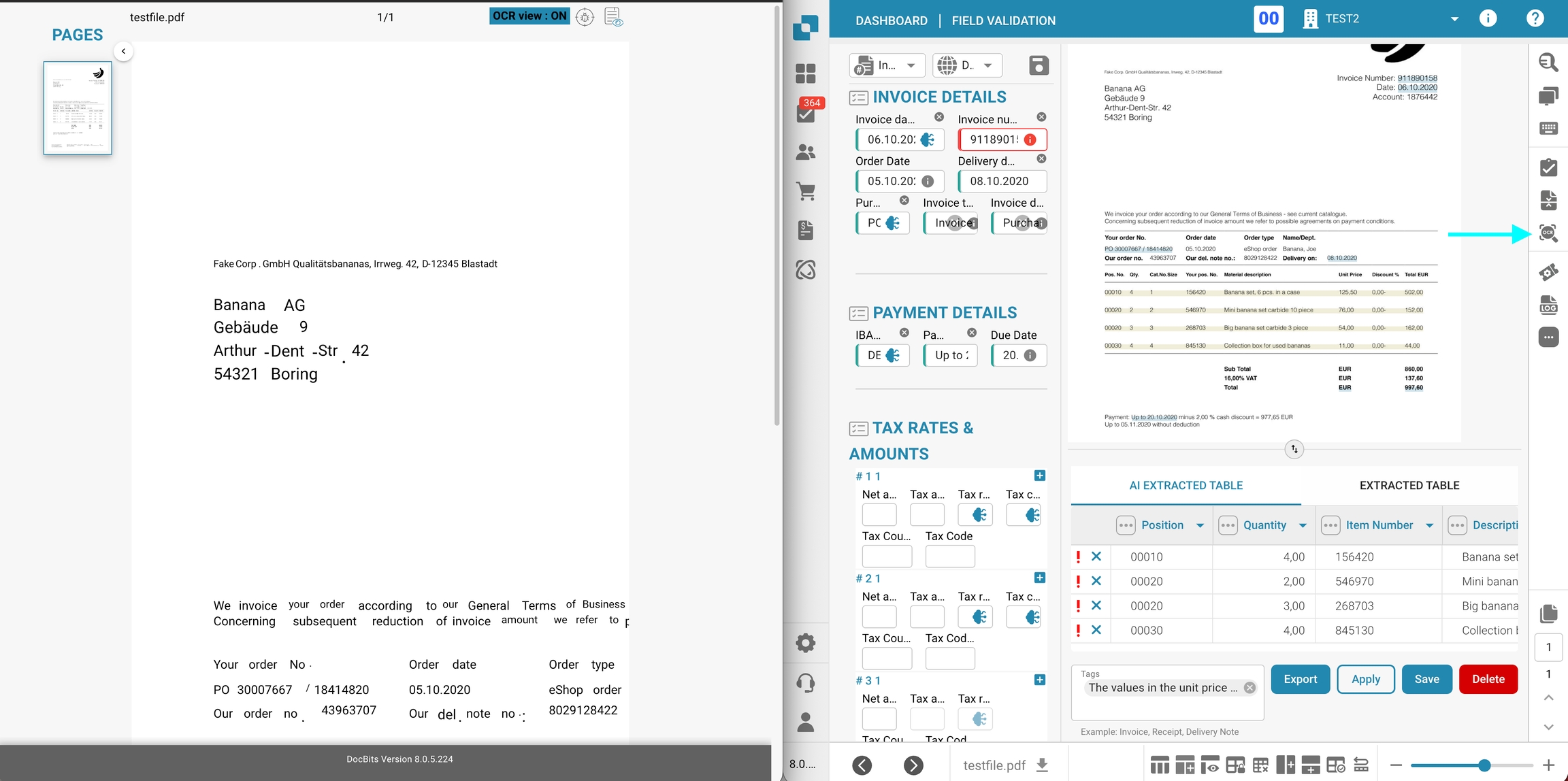 Ajout de l'accès utilisateur aux résultats d'extraction OCR : Le bouton Vue OCR sur l'écran de validation des champs est désormais accessible à tous les utilisateurs ayant un accès de validation, plutôt que d'être limité aux administrateurs. Avec cette mise à jour, tout utilisateur autorisé peut consulter directement les résultats d'extraction OCR, facilitant la validation de l'exactitude des données et le suivi des performances globales de l'OCR. Cette amélioration favorise une plus grande transparence et améliore l'efficacité du flux de travail de validation.