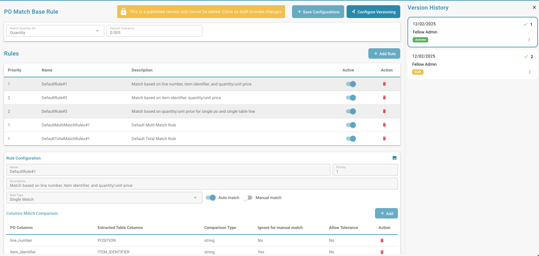 Personnalisation améliorée des règles de rapprochement des commandes : DocBits offre désormais un contrôle plus granulaire et personnalisable sur les règles de rapprochement des bons de commande. Les administrateurs peuvent configurer avec précision quelles colonnes doivent être évaluées pendant le processus de rapprochement pour chaque type de document, en s'assurant que seuls les champs les plus pertinents sont pris en compte. De plus, des tolérances peuvent être définies au niveau des colonnes, offrant une plus grande flexibilité lors du traitement des écarts mineurs. Chaque règle peut également être configurée pour s'appliquer au rapprochement manuel, au rapprochement automatique ou aux deux, donnant aux équipes la possibilité d'adapter le flux de travail de rapprochement à leurs exigences opérationnelles exactes. Ces améliorations améliorent considérablement l'adaptabilité et la précision du processus de rapprochement des bons de commande.